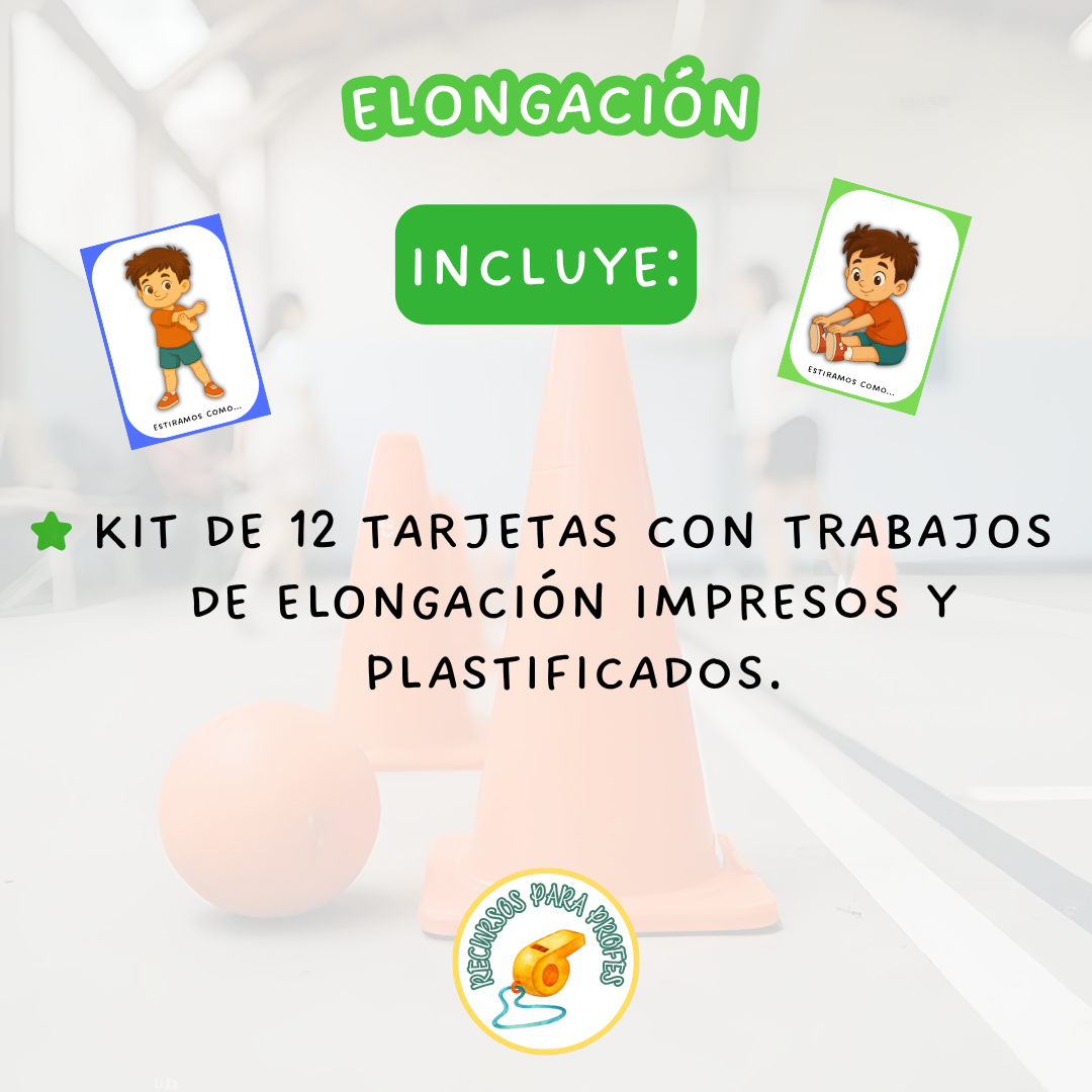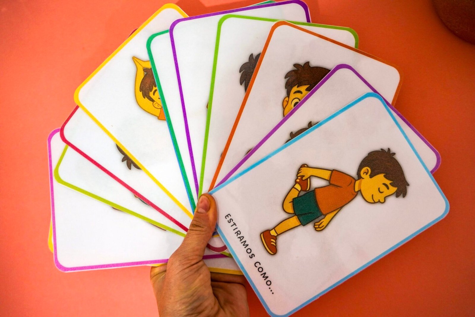 Incluye 12 tarjetones con distintas formas para elongar, pensadas especialmente para acompañar el momento de vuelta a la calma o para trabajar la flexibilidad de manera lúdica.