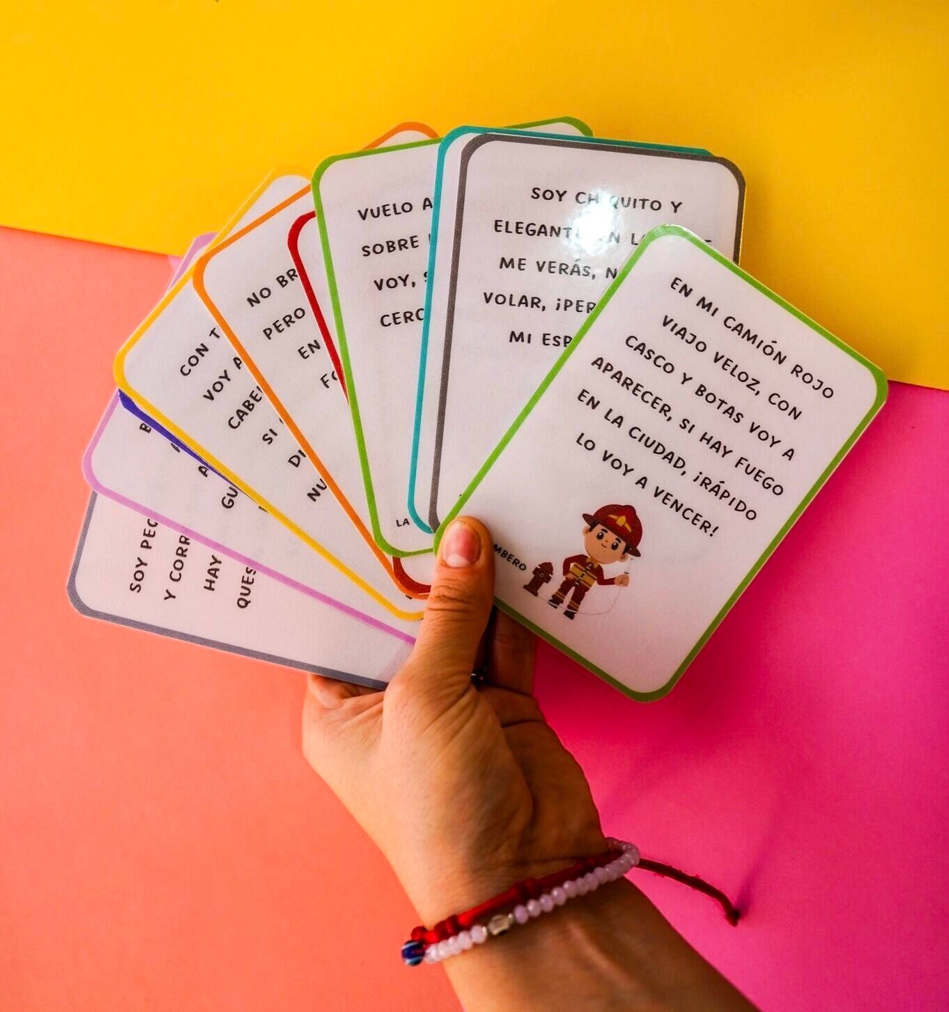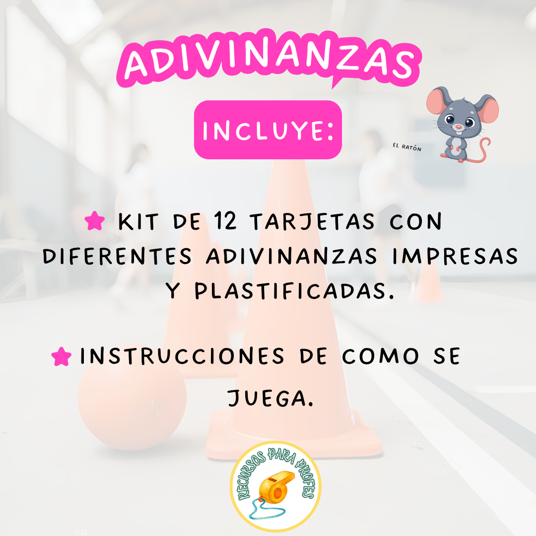 Incluye 12 tarjetas con diferentes adivinanzas impresas y plastificadas.